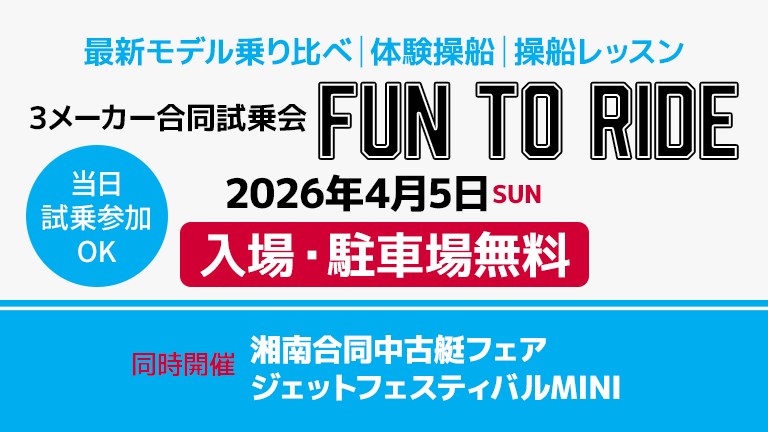 いよいよ今週末、湘南で「3メーカー合同試乗会FUN TO RIDE」「湘南合同中古艇フェア」「ジェットフェスティバルMINI」の3イベントが同時開催されます。 FUN […]