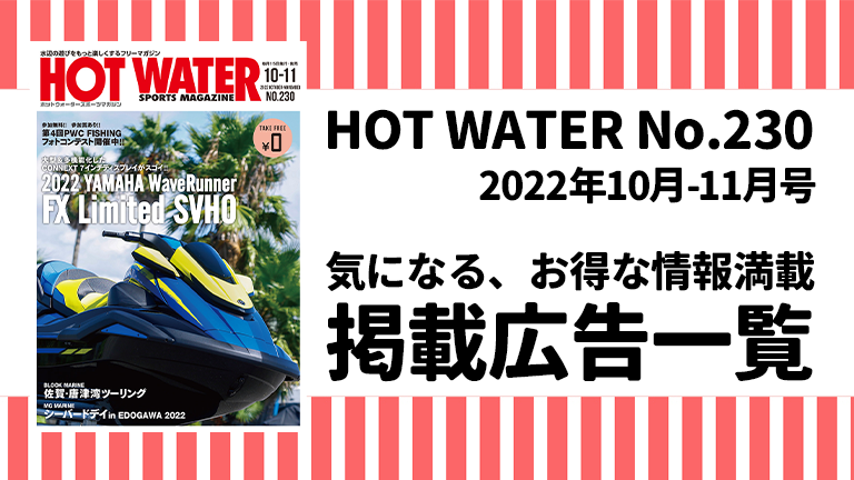 月刊ホットウォータースポーツマガジンNo.230は、2022年10月15日(土)から、全国の水上バイク販売店、マリーナなどのマリン関連施設にて、無料配布をしています。 […]