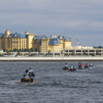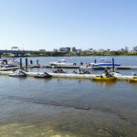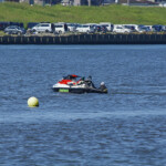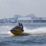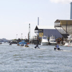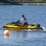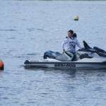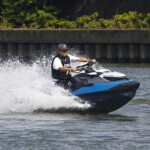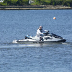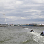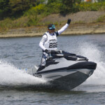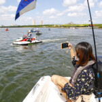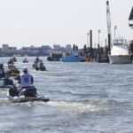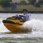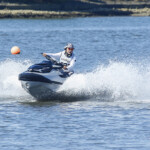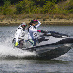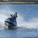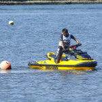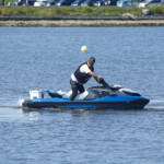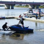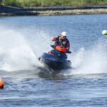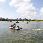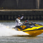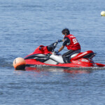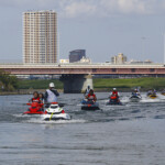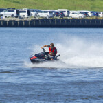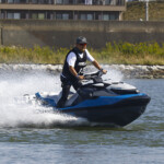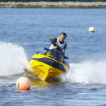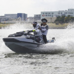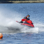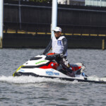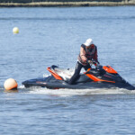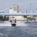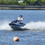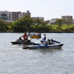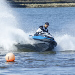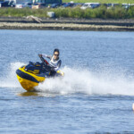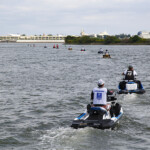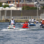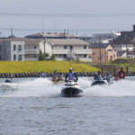 MG MARINEのメンバーが整列して徐行していると、前方から水上バイクが接近。なかなか速度を落とさないまま徐行エリアに近づいてきましたが、こちらの様子を見て察したのか減速。その後はしっかり徐行していました。