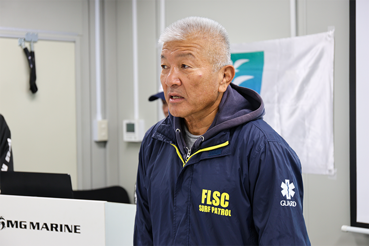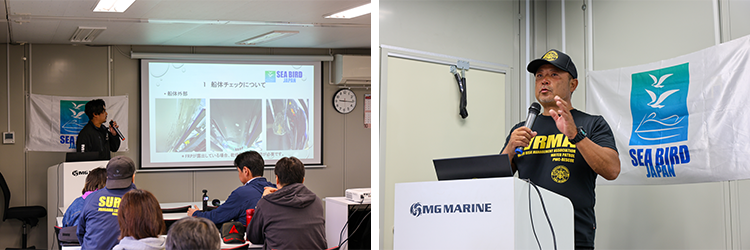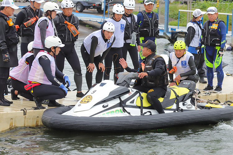 午前の部の前半は、MG MARINEのメカニックの渕さんが担当し、水上バイクのメンテナンスや洗浄、保管方法などについて講義。後半は、ウォーターリスクマネジメント協会の今西理事長から、水上バイクレスキューに欠かせない知識や技術、体力、救助活動に対する考え方などが紹介されました。