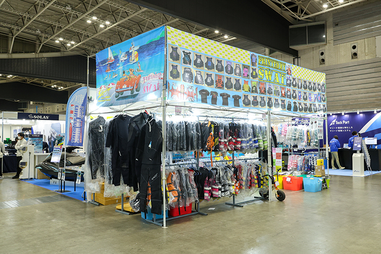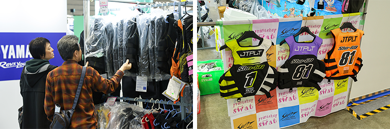 群馬県の水上バイクショップ『ガレージスワット』のブースには、ライフジャケットをはじめとした特別価格のアイテムが並びました。