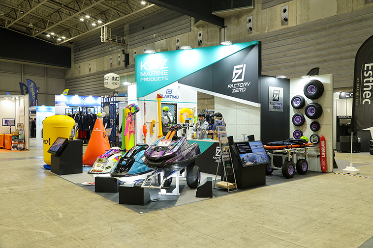 水上バイクを運搬するためのジェットランチャーをはじめとしたアルミ製品を製造・販売する『ファクトリーゼロ』のブースは、3艇のスタンドアップマシンをメインに展示。
