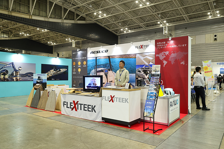 水上バイクやボートのアイテムを輸入・販売する『レスコ』のブースでは、船舶用のチーク調床材「FLEXITEEK(フレキシチーク)」をメインに展示。