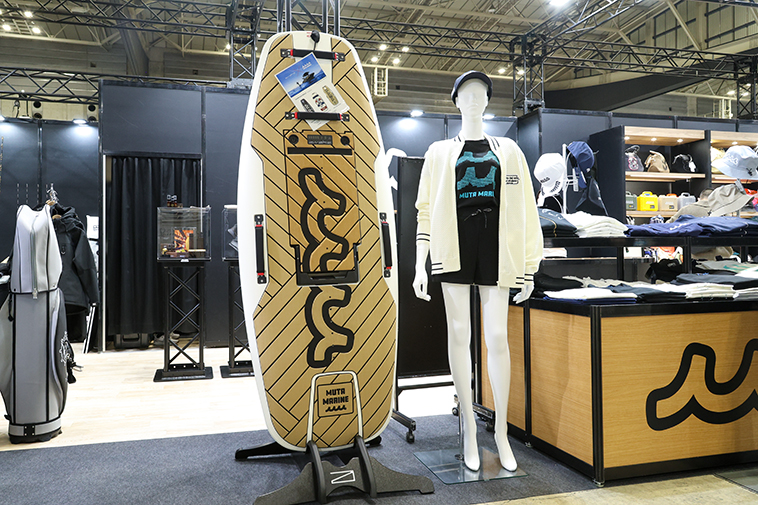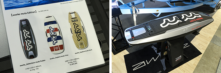 電動ジェットボード「awake(アウェイク)」とmuta MARINE(ムータマリン)のコラボモデルを展示。