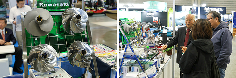 水上バイク用のインペラを製造・販売する『ソラス』のブースでは、最新のインペラを中心に展示。