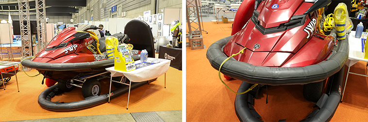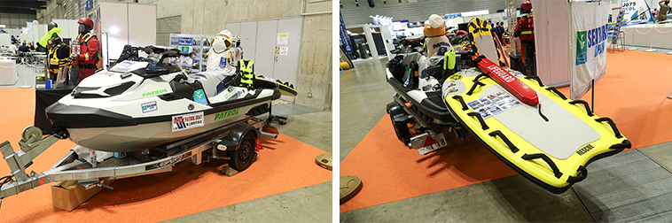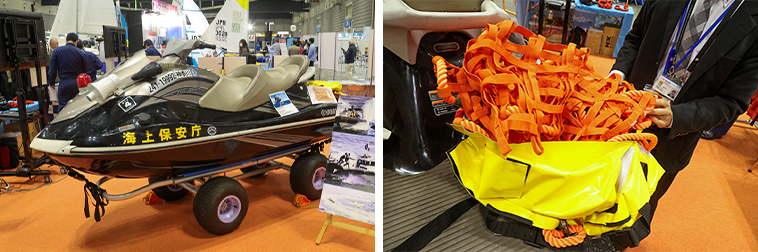 海上保安庁の水上バイクには曳航用のネット「Tsunagi繋」が装備され、三成インターナショナルは安定性の向上と船体を保護する「ジェットエアフロート」装着艇を展示。