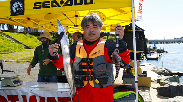 88.4cm・0.7kgの長~いタチウオを釣り上げた島岡智樹さんが3位入賞。