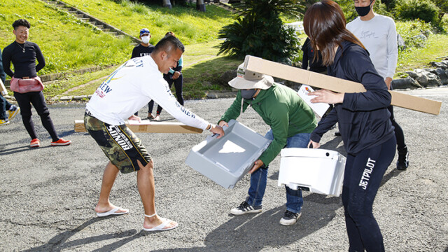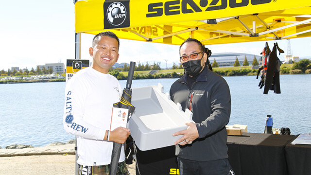 ちなみに(今はまだ)FISH PROのオーナーではないおかまりさん。2位の副賞でゲットしたLinQクーラーボックスは、じゃんけん大会の勝者に贈られました。
