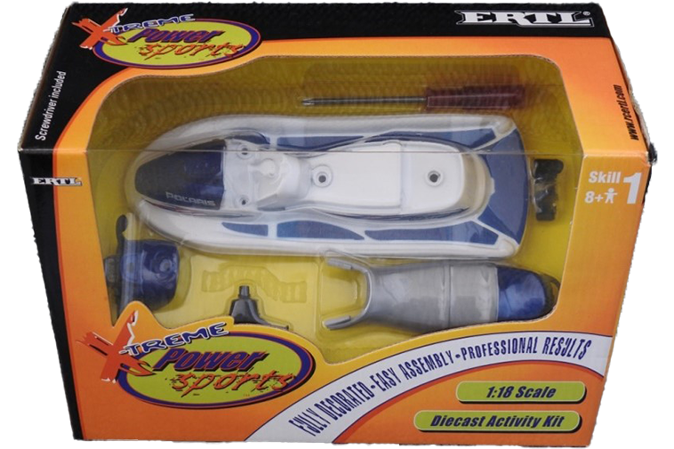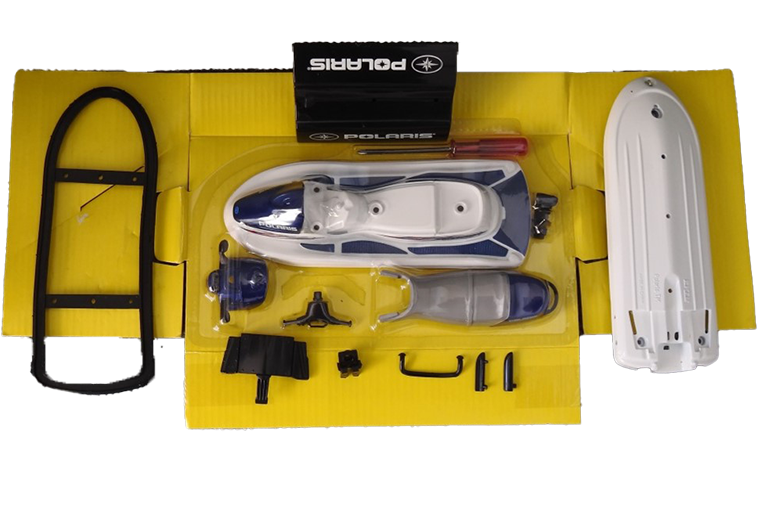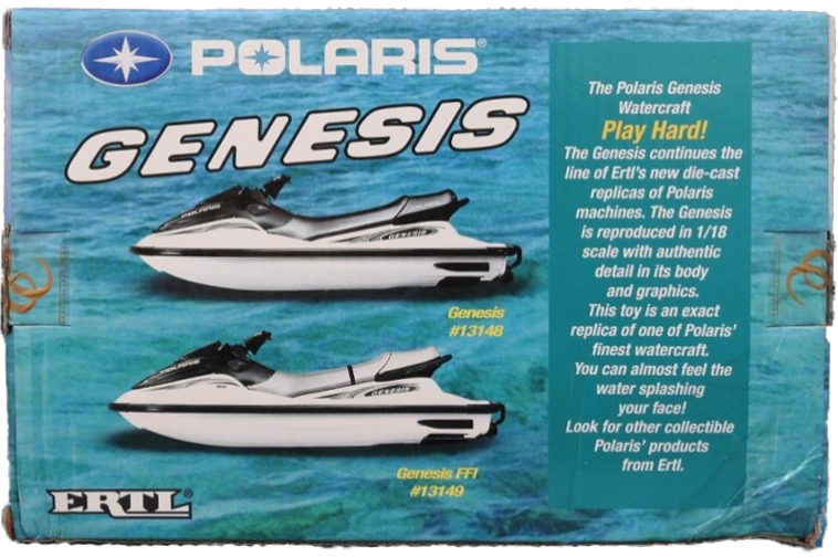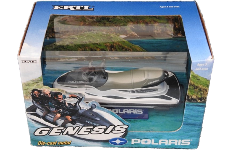 Genesisは両サイドにオフロードバイクとATVが描かれた、スポーツ性を強くイメージさせるパッケージに収められています。組み立て式とわかるようにキットパーツが配列されており、POLARISのロゴ入り展示船台は裏側に入っています。