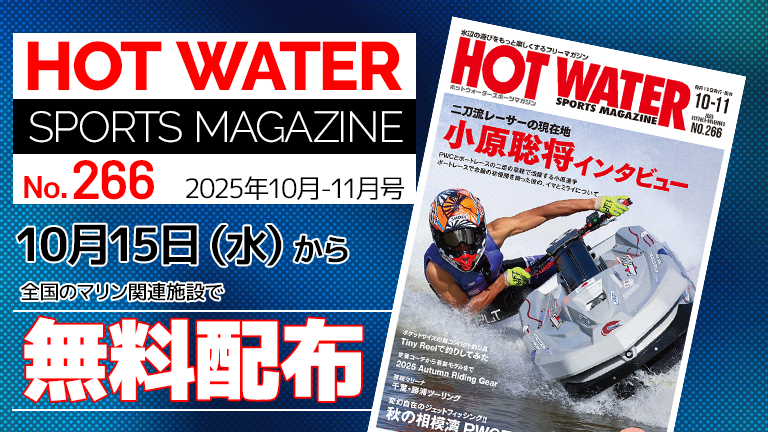 月刊ホットウォータースポーツマガジンNo.266は、2025年10月15日(水)から、全国の水上バイク販売店、マリーナなどのマリン関連施設にて、無料配布をしています。
