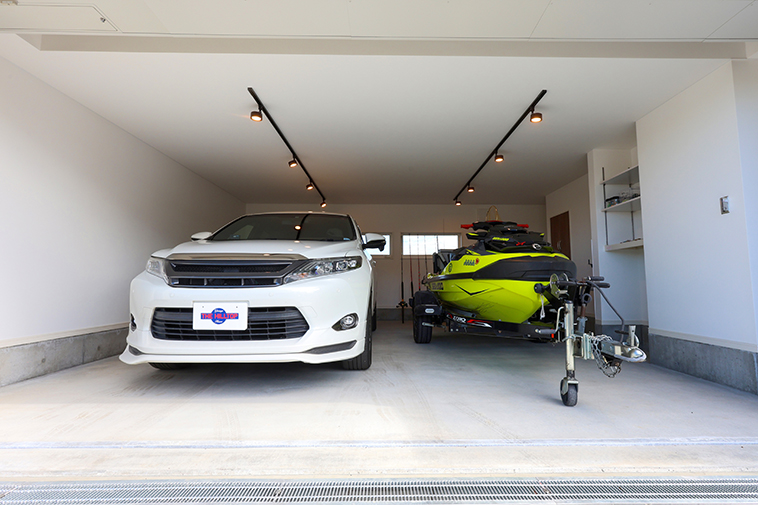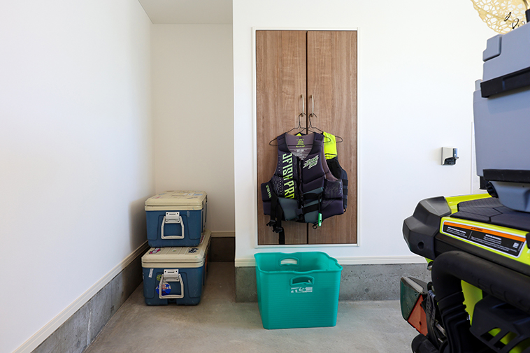 「ガレージなら水上バイクと釣りの道具が一か所にまとめておけるので、前日の準備も捗ります。