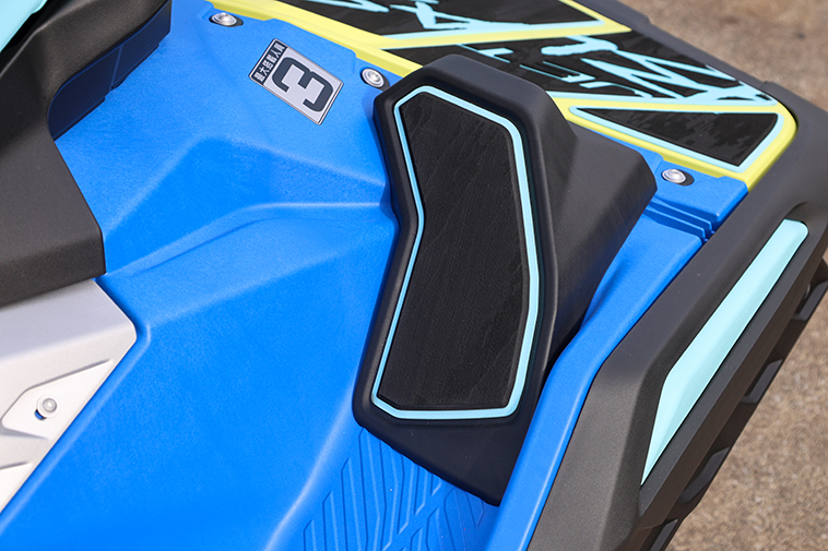 リアデッキのリボーディンググリップを併用することで再乗艇がさらに容易に。リアデッキのマットには、モデル名が大きくデザインされています