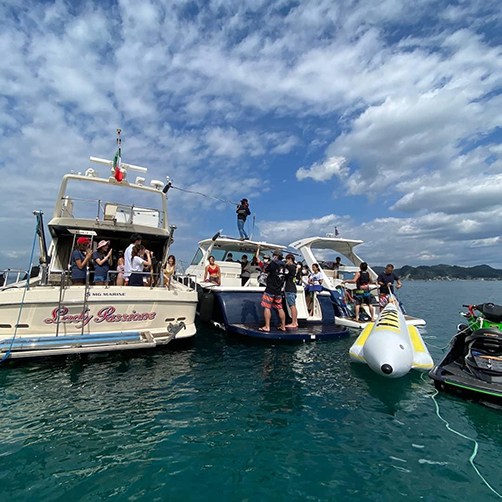 早朝6時、メインMCを務めるモデルでテンプル大3年、松尾紗夜(26)、アシスタントMCの法大4年、水谷憲正(22)、“海ずきんちゃん”と呼ばれる海遊び初心者の女子大生やモデル8人の計10人が、東京・夢の島マリーナに集合。3艇のクルーザーに分乗し、貴重な操縦体験をしながら千葉・南房総市の富浦沖へ繰り出し、マリンスポーツを体験。