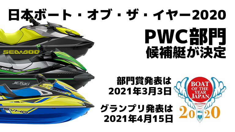 第1次選考は小型ボートや中型ボート、そしてPWCなど各部門ごとにおこなわれ、日本ボート・オブ・ザ・イヤー2020のPWC部門は、下記3モデルが候補艇となった。