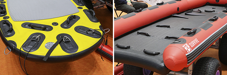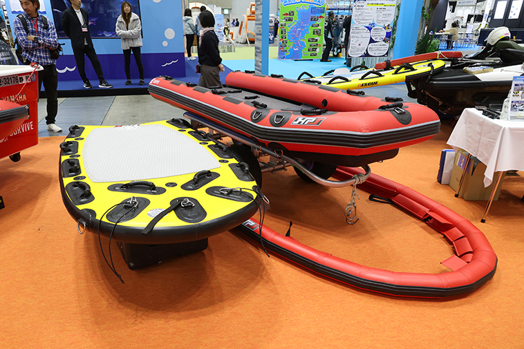 ウォーターセーフティビレッジにはホットプロダクツジャパンのレスキュースレッド(写真左)やレスキューボード(写真右)をはじめとした、災害時に役立つノリモノやアイテムを展示。