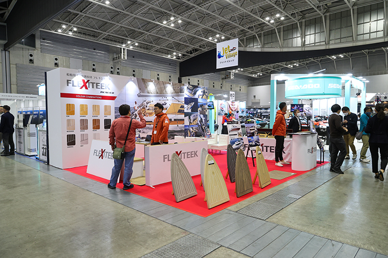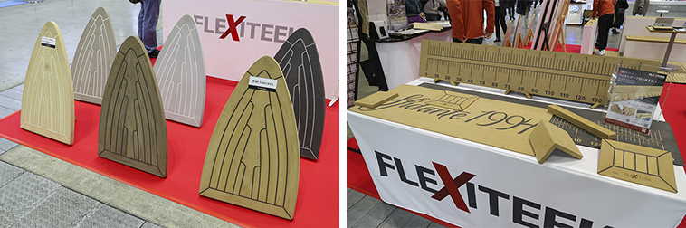 木目調の美しいデザインながら、汚れが浸透しにくくお手入れも容易な船舶用チーク調床材『フレキシチーク』を展示していたレスコブース。
