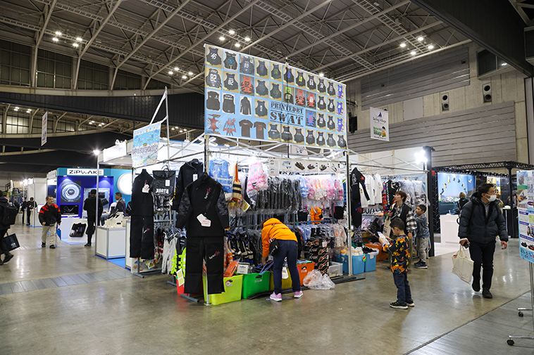 水上バイク用のウェアを中心に、ボートショー特別価格で販売していたガレージスワットのブース。