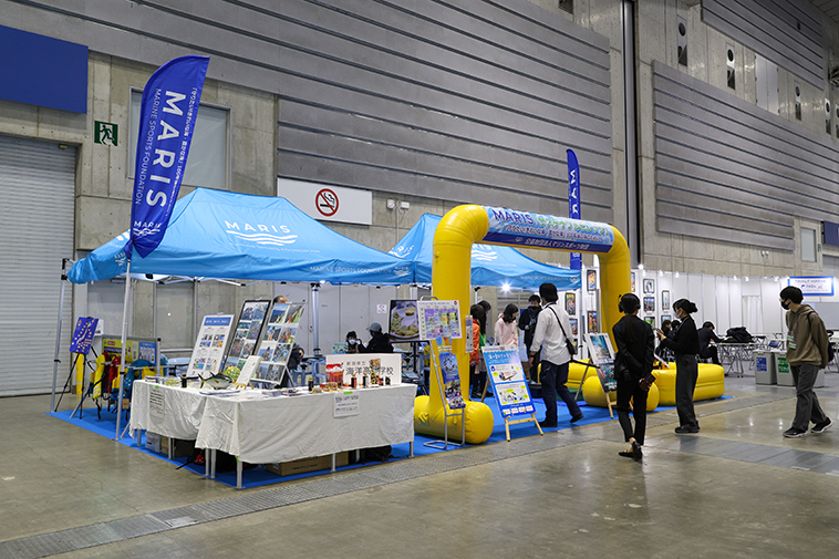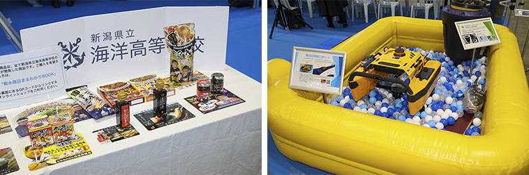 新潟県立海洋高等学校の生徒が開発した商品や、海洋浮遊ゴミを自動回収する装置を展示していたマリンスポーツ財団のブース。
