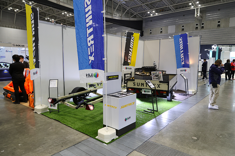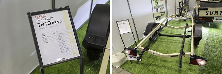 サン自動車のブースでは、水上バイク用トレーラー『TB10』にサンドカラー塗装などを施したカスタムモデルを展示。