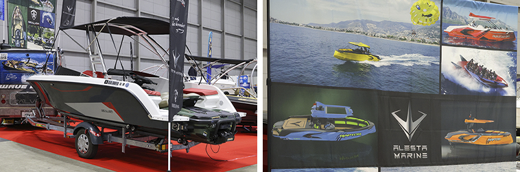 『水上バイクと合体するボート』でお馴染みのWAVE BOATを展示していたホースジャパンのブースでは、今後取り扱いを予定しているALESTA MARINEのボートもプロモーション。
