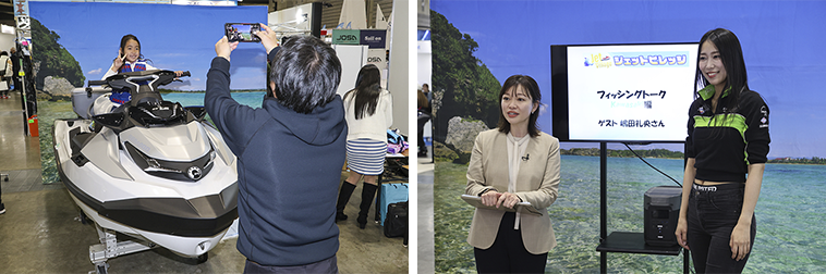 水上バイク関連ブースの見どころを紹介する動画配信もおこなわれていました。