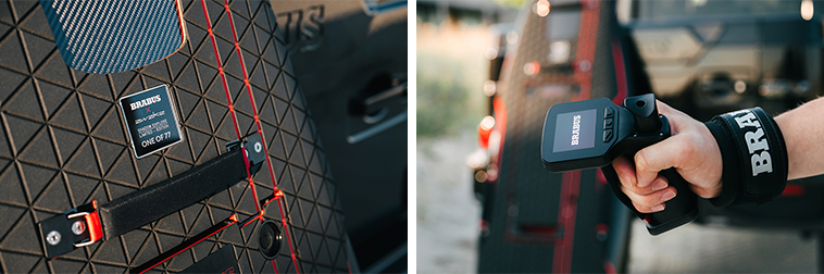 ボトムにはBRABUSのロゴが大きくあしらわれ、特徴的なデザインのデッキマットや随所に散りばめられた赤のアクセントカラー、さらには走行中にテールエンドをさりげなく照らすボルドーのLEDライトなど、外観も特別な仕上がりになっています。