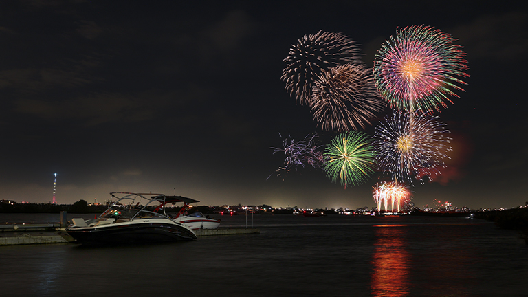 日本屈指の花火大会として人気の「江戸川花火大会」も江戸川の河川敷を埋め尽くす来場者でしたが、陸上だけでなく水上にも数多くの屋形船やプレジャーボートが停泊。