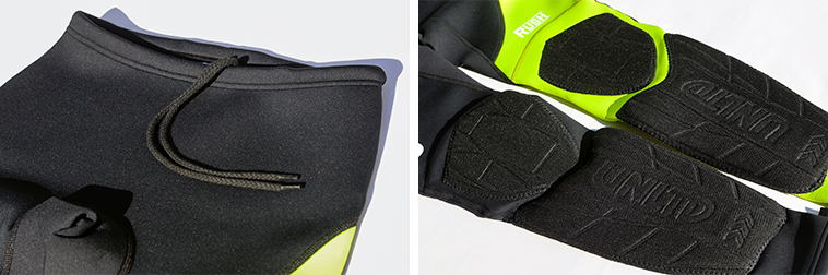 2.5mmフレックスクロロプレンは抜群の履き心地で、膝の曲げ伸ばしをスムーズにするフレクション構造や衝撃や摩耗を軽減するニーパッドなどの装備も充実。
