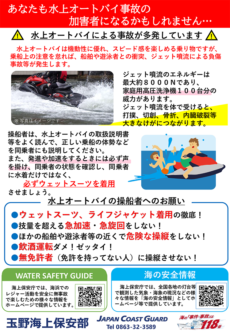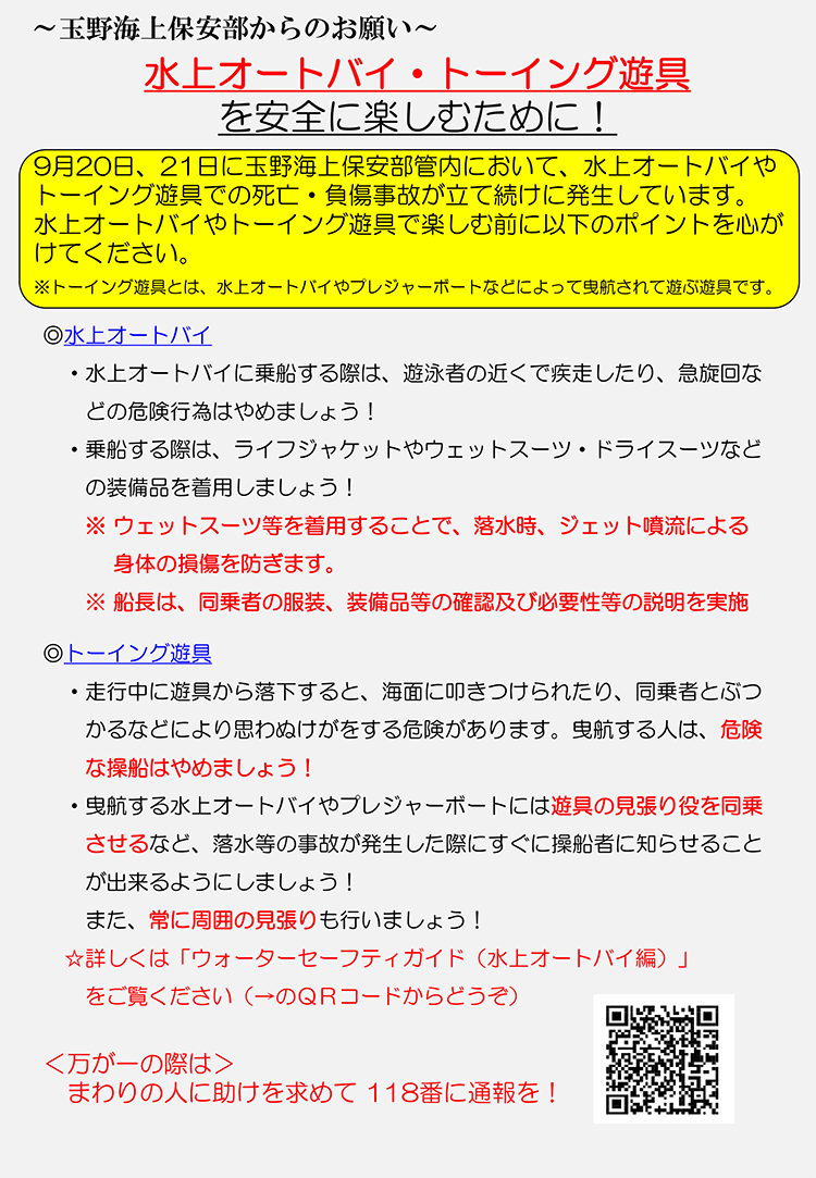 2025年9月20日(土)、21日(日)に、岡山県玉野海上保安部管内において水上オートバイやトーイング遊具での死亡・負傷事故が立て続けに発生。水上オートバイやトーイング遊具で楽しむ前に際の心がけなど、注意喚起が行われている。
