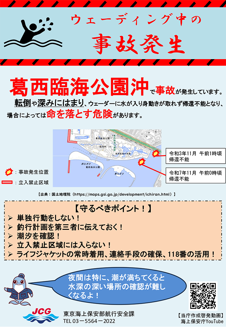 東京海上保安部では、ウェーディングでの事故防止に加え、ウェーディング中のひとの付近を航行する際の注意や、事故を目撃した場合の118番通報など、注意喚起をおこなっています。