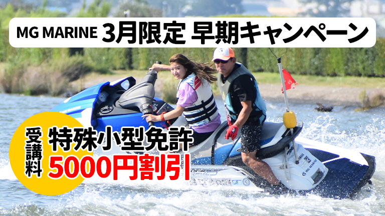 千葉県市川市のエムジーマリーンでは、2026年3月の講習限定で、特殊小型船舶免許講習の受講料が5000円引となる「2026年3月限定 早期キャンペーン」を実施します。