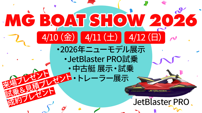 千葉県市川市のエムジーマリーンは、2026年4月10日(金)から12日(日)まで「MG BOAT SHOW 2026」を開催します。2026年モデル展示やJetBlaster PROの試乗、水上バイクやスポーツボートの中古艇の展示と試乗、トレーラーなどを展示。来場プレゼントや試乗&お見積プレゼント、成約プレゼントなども用意され、ボートショー特別価格での販売となります。