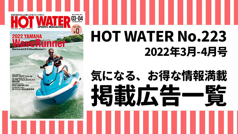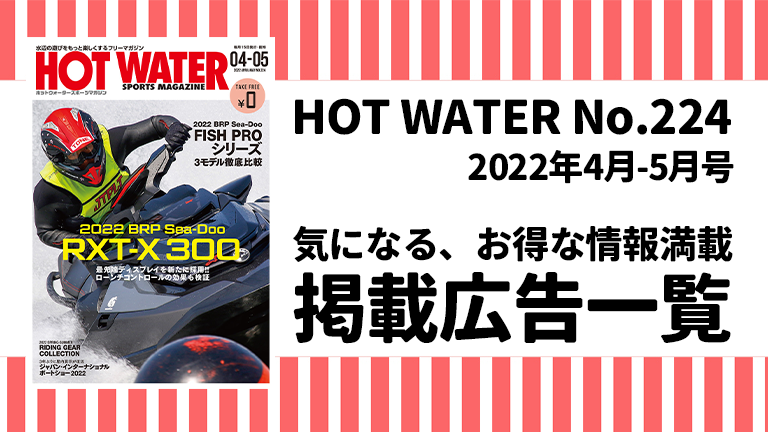 月刊ホットウォータースポーツマガジンNo.224は、2022年4月15日(金)から、全国の水上バイク販売店、マリーナなどのマリン関連施設にて、無料配布をしています。 ※ […]