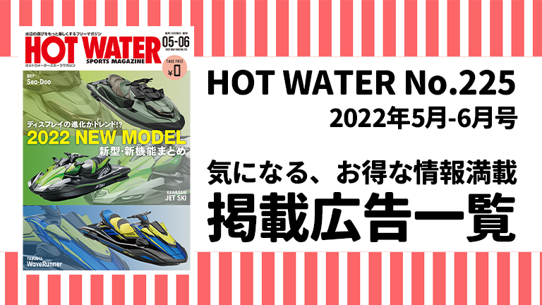 月刊ホットウォータースポーツマガジンNo.225は、2022年5月15日(日)から、全国の水上バイク販売店、マリーナなどのマリン関連施設にて、無料配布をしています。 ※ […]